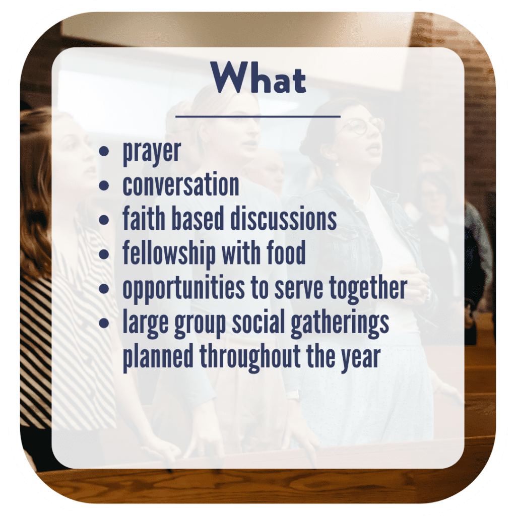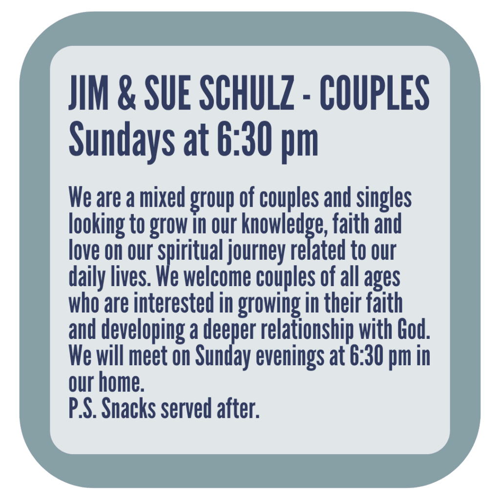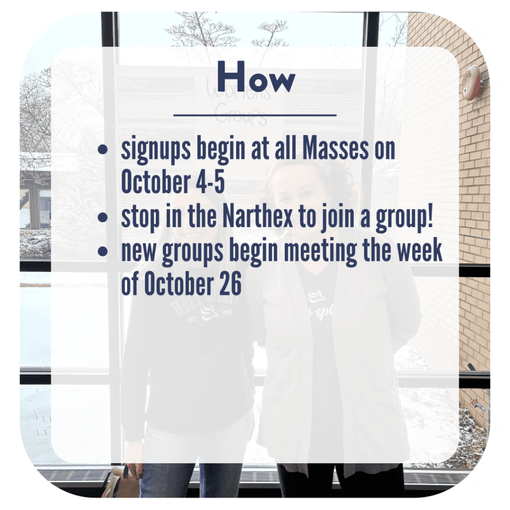 It’s our goal is to make a big parish feel like a small community, one group at a time! People join groups for different reasons; some for new faithful connections with others and some for a deeper spiritual journey that challenges them in new ways.